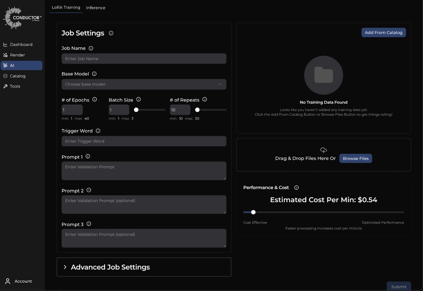 Open the Conductor interface , and navigate to AI -> LoRA Training and click the “New” button.