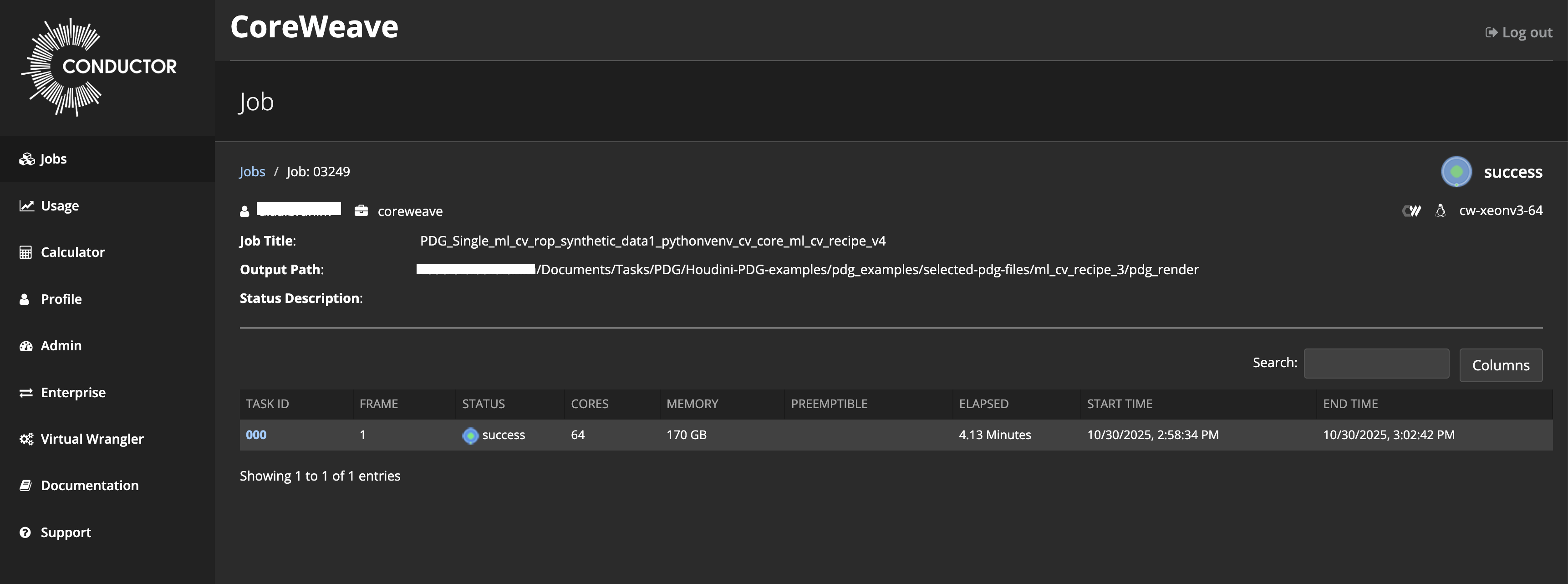 In the Conductor Dashboard monitor your job and when complete, click on the task ID to view a detailed job log.