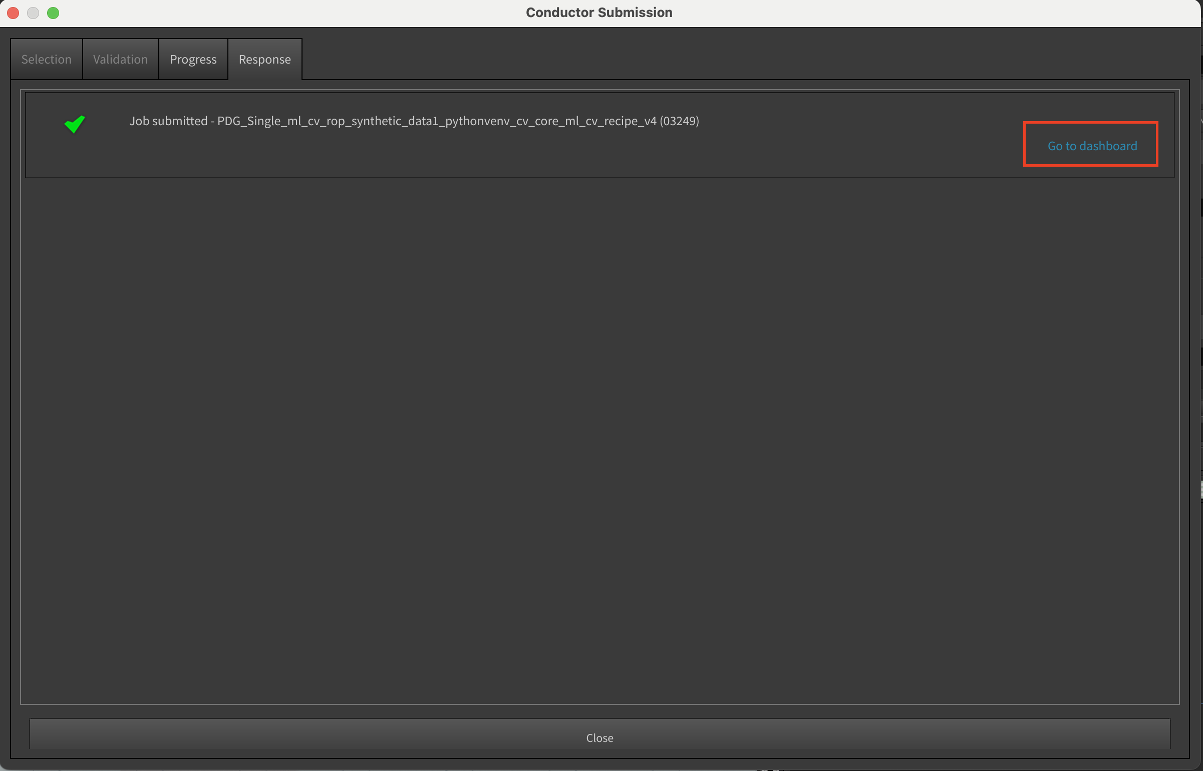 Finally you should see the Response tab of the Conductor Submission Dialog. Click on the "Go to dashboard" which will take you to the job page in the Conductor Dashboard.
